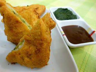 Cut a bread pakoda into equal pieces, place on a plate and serve immediately with meetha chutney, teekha chutney, sukha lehsun ka chutney and fried green chillies.