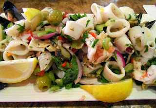Put all the poaching broth ingredients together in a medium pot, cover and bring to a boil. Turn off the heat to let the flavors steep while you cut the veggies.While the poaching broth is steeping, dice the yellow pepper, seed and dice the tomatoes and slice the celery stalks very thin. Chop the chives. Juice the lemons and remove any seeds. Put the peppers, tomatoes and celery into very large bowl. Most cocktail shrimp are pre-cleaned and cooked, so you can put them in the bowl, too.Bring the poaching broth back to a boil and add all the clams. Boil few minutes.As soon as you see each clam open, fish it out and set it aside. Remove the meat and put in the bowl with the veggies. Turn off the heat and put the scallops in the poaching water. Cover the pot and let stand for few minutes. Fish out the scallops and put into the bowl.Bring the broth to a boil once more. Add the calamari rings and boil few seconds, then pour the contents of the pot into a strainer set over a bowl. You can save the broth or discard it. Pick out all the calamari rings and add to the bowl.To finish, add the olive oil and a little salt and half the lemon juice. Mix well. Finally, mix in the chives and chill. This salad is better a few hours after it's made.